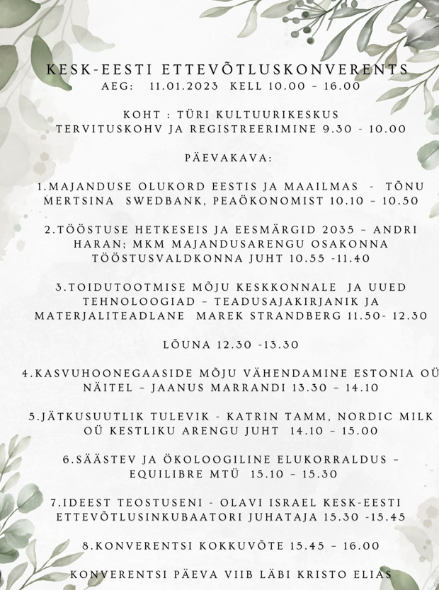 Ettevõtluskonverentsi pealelõunast programmi alustab Türi vallavolikogu ja Estonia Farmid OÜ juhatuse liige Jaanus Marrandi ülevaatega kasvuhoonegaaside mõju vähendamisest Estonia OÜ näitel. Jätkusuutlikust tulevikust rääkimisega jätkab Nordic Milk OÜ kestliku arengu juht Katrin Tamm.