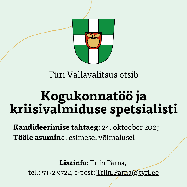 Türi Vallavalitsus loob täiesti uue ametikoha ning ootab oma meeskonnaga liituma kogukonnatöö ja kriisivalmiduse spetsialisti (tähtajatu töölepinguga).