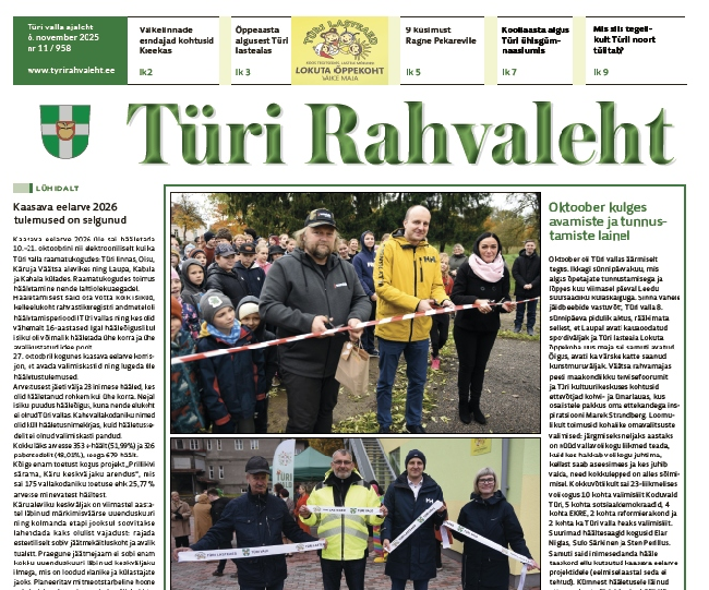 Lähipäevil jõuab kõikidesse Türi valla postkastidesse novembrikuu Türi Rahvaleht! Sedakorda lehes: • Oktoober kulges avamiste ja tunnustamiste lainel • Väikelinnade esindajad...