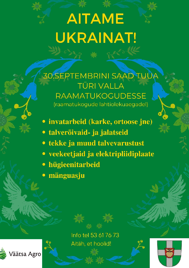 Head Türi valla elanikud ja ettevõtted, kes te olete taas valmis oma abikäe ulatama. Talv on tulemas ning võidu poole pürgimiseks on Ukrainas vaja talveks valmis olla. Ukrainasse on väga...